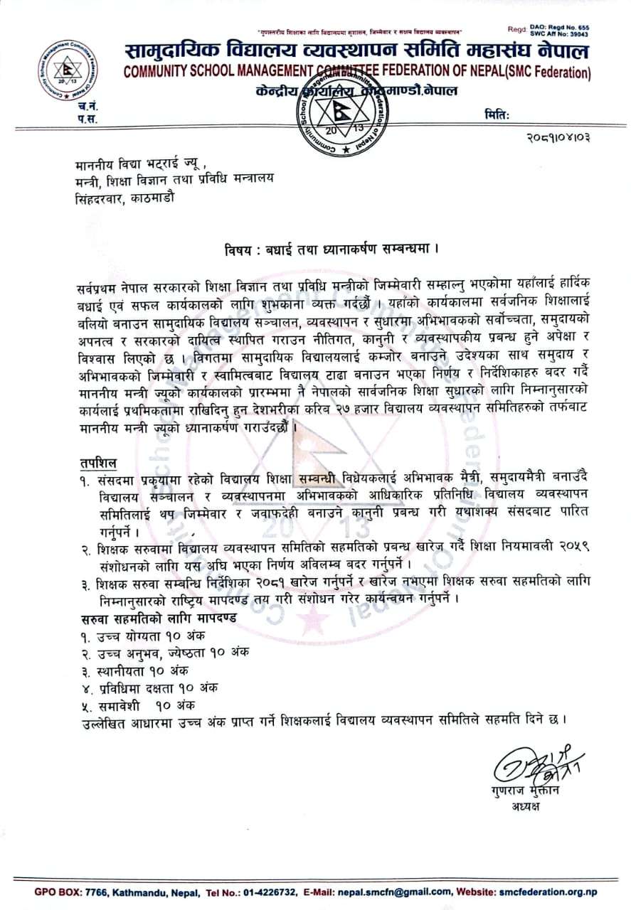 काठमाडौँ ।साउन ५।।सामुदायिक विद्यालय व्यवस्थापन समिति महासंघ नेपालले शिक्षा, विज्ञान तथा प्रविधि मन्त्रालयले जारी गरेको शिक्षक सरुवा सम्बन्धीको निर्देशिका खारेज गर्न माग गरेको छ । नवनियुक्त मन्त्री विद्या भट्टराईलाई ज्ञापनपत्र बुझाउँदै महासंघले यसअघिको शिक्षामन्त्री सुमना श्रेष्ठले जारी गरेको निर्देशिका खारेज गर्न माग गरेको हो ।