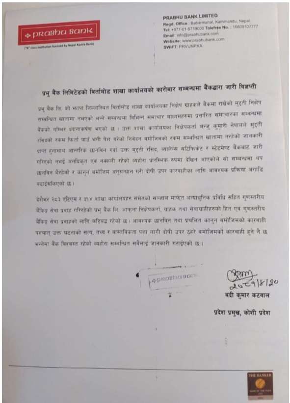 विज्ञप्ति निकाल्दै प्रभु बैंकले भन्यो मुद्दती रसिद, व्यालेन्स सर्टिफिकेट र स्टेटमेण्ट नक्कली